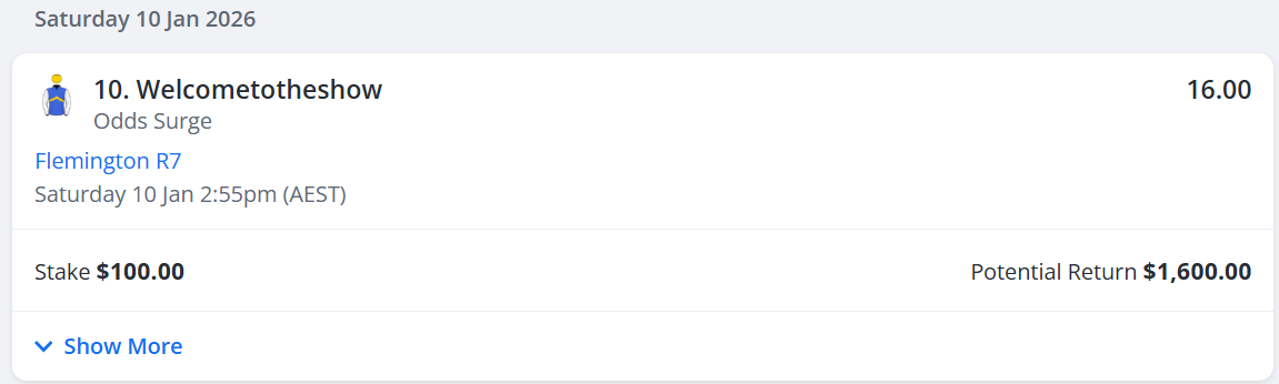 For my Week 43 bet, I’ve had $100 on Welcometotheshow @ $16