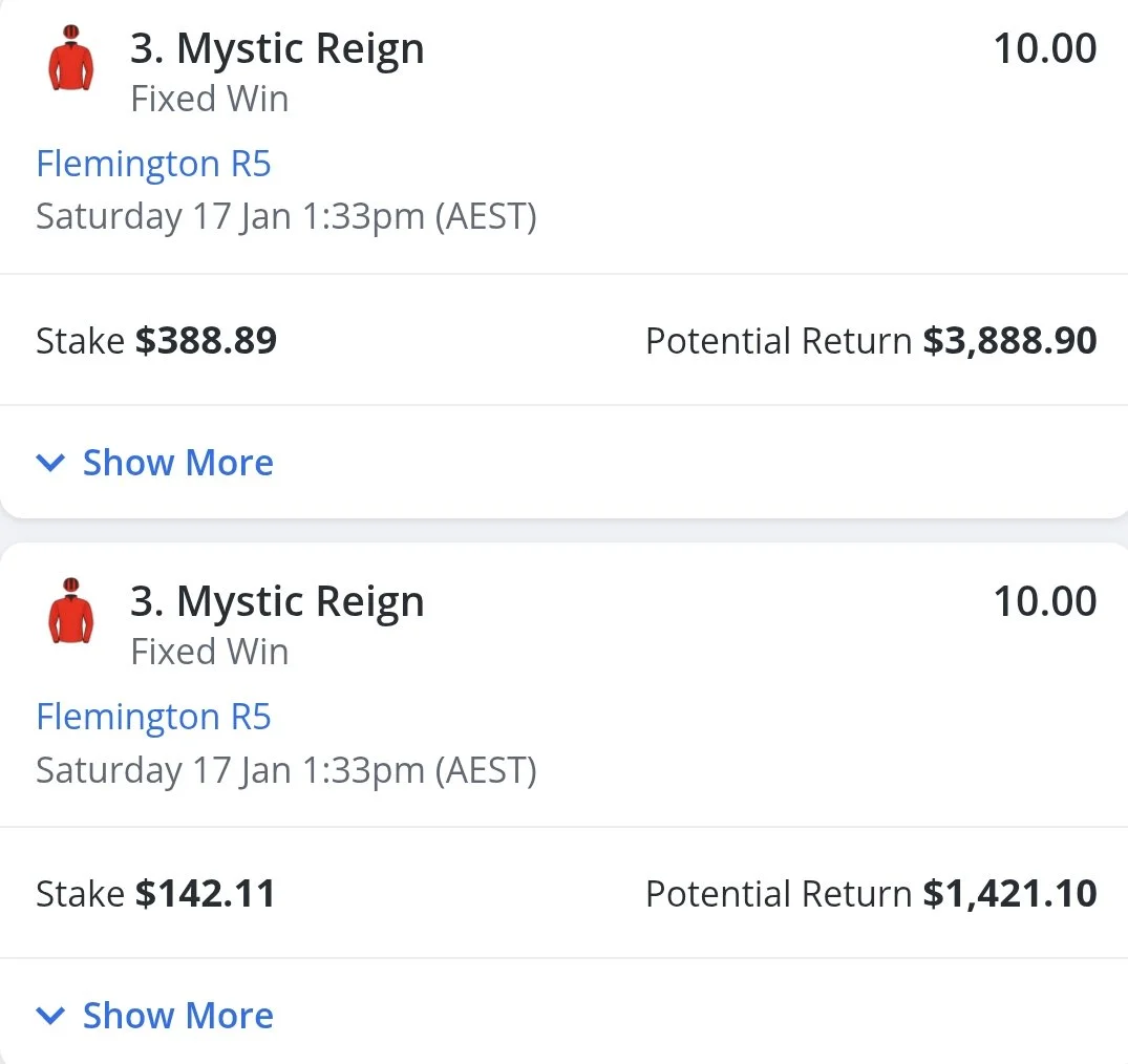 For my Week 44 bet, I’ve had $531 on Mystic Reign@ $10