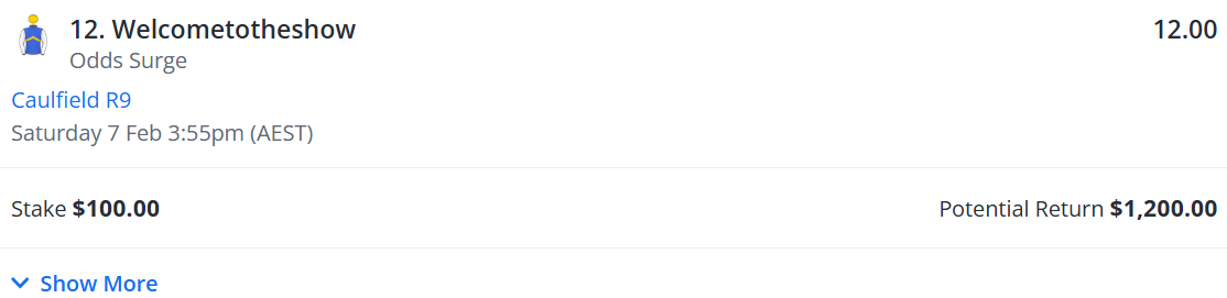 For my Week 47 bet, I’ve had $100 on Welcometotheshow @ $12.