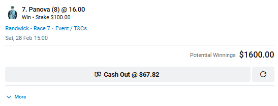 For my Week 50 bet, I’ve had $100 on Panova @ $16.